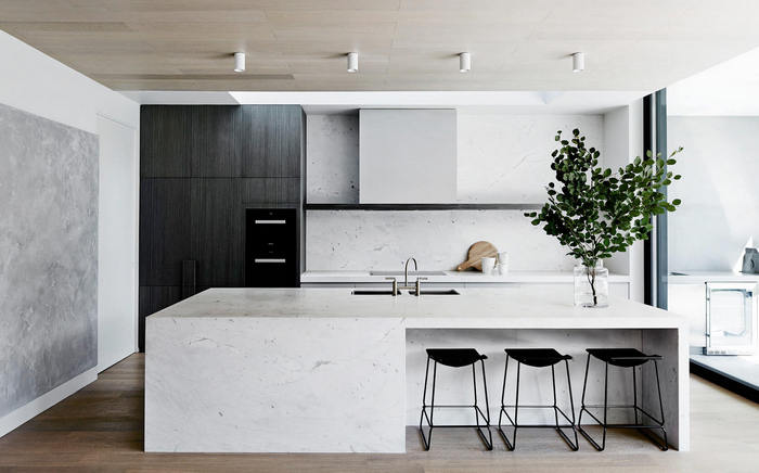 Сейчас модно устанавливать на кухне остров, который выполняет роль рабочей поверхности, системы хранения и иногда обеденного стола. Дистанция между ним и другой мебелью должна быть не менее 100-120 сантиметров.